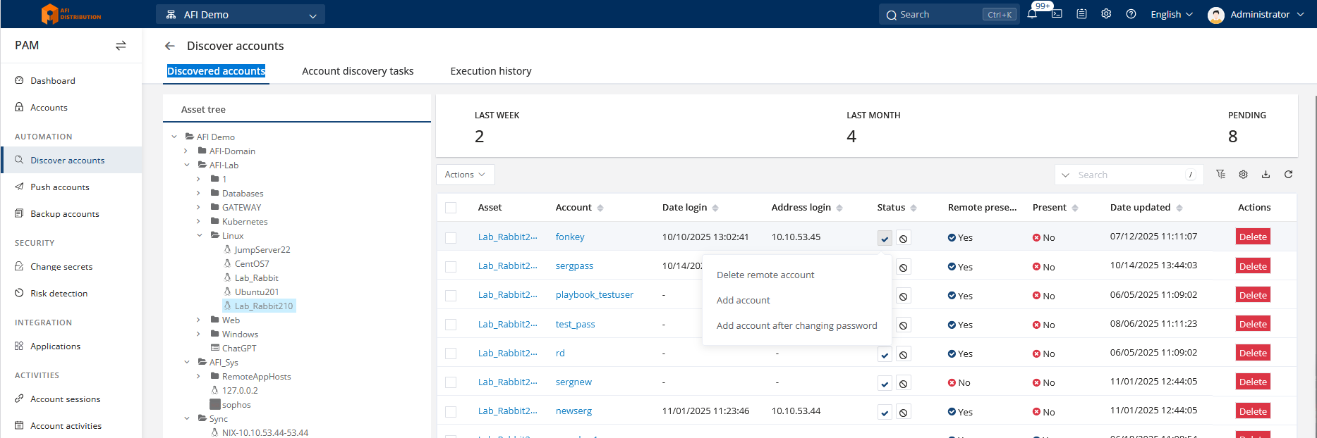 Обнаруженные УЗ вы увидите в разделе PAM - Automation - Discover accounts на вкладе Discovered accounts: